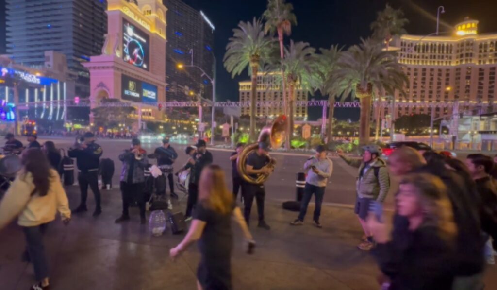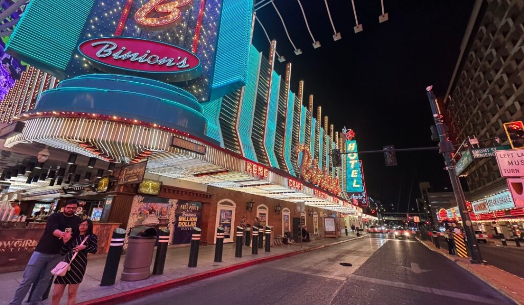 At Fremont Street Experience the scale shrinks and the personality grows — music, street performers, unpredictable energy.